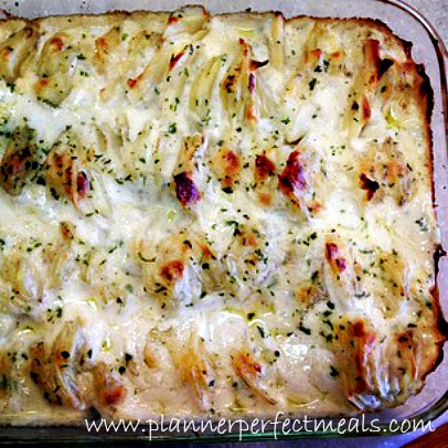 Pour your cream sauce over your stacked potatoes in your greased 9×13-inch baking dish, sprinkle with parsley and bake, uncovered, at 375° for 45 minutes, bubbly and golden brown.